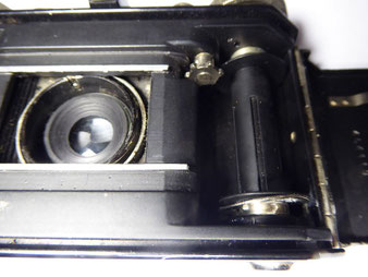 Neben dem damals „optimalen“ kleinen optischen Sucher hatte sie auch innen etwas Neues zu bieten. Bei Leica und Contax wurde der Film (beim Spannen des Verschlusses) von Zahnrädern gezogen. Bei Kodak dachte man sich etwas anderes aus. Beim Transport wird der Film nicht von den Zahnrädern gezogen, sondern direkt von der Spule unter dem Transportknopf. Das verringert die Gefahr des Ausreißens der Perforation durch etwas ungestüme Amateur-Hände. Sie hat aber trotzdem ein Zahnrad, das aber nur mitläuft und dabei die Filmlänge abmisst und nach den von Barnack vorgegebenen acht Löchern den Transport anhält. Das war genial einfach und wurde praktisch von allen späteren Amateur-Kleinbildkameras übernommen - bis dann die Schnelltransport-Hebel in den frühen 50er Jahren wieder zum Zahnrad-Transport zurückkehrten.